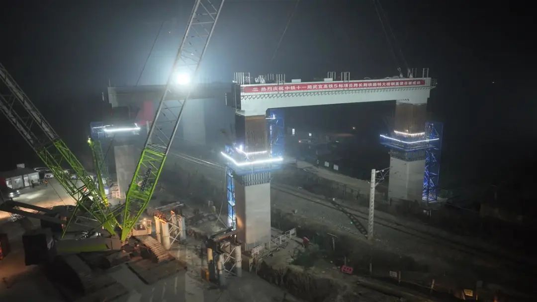 12月21日5时零5分,经两天两夜的施工,由中铁十一局承建的沿江高铁武宜段跨长荆铁路特大桥192号、193号门式墩钢盖梁完成吊装。