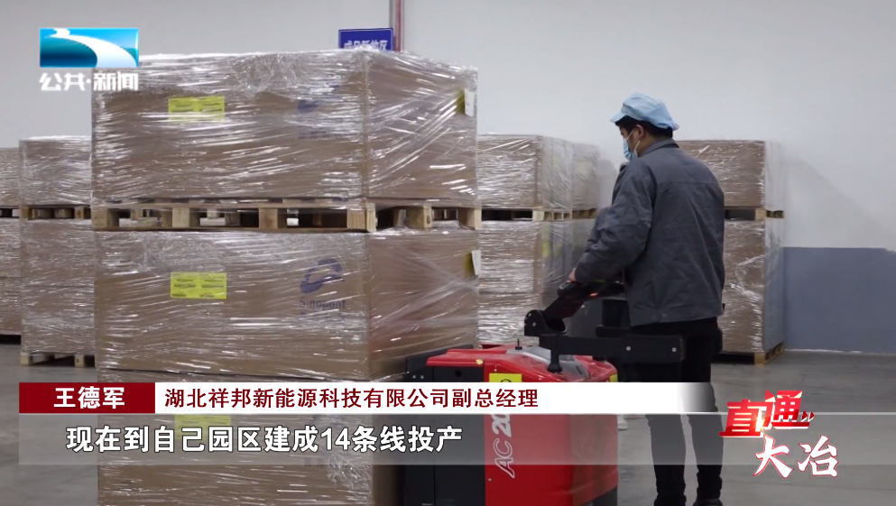 湖北祥邦新能源科技有限公司副总经理 王德军:“从租赁厂房、过渡厂房的10条线,现在到自己园区建成14条线投产,已经有24条线投产,预计在明年6月份28条线全部投产,总产值能达到30个亿左右。”