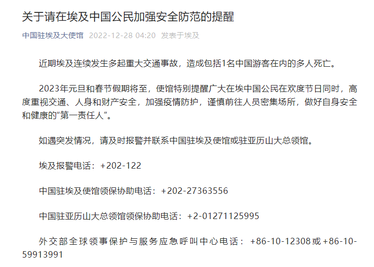 2023年元旦和春节假期将至,使馆特别提醒广大在埃中国公民在欢度节日同时,高度重视交通、人身和财产安全,加强疫情防护,谨慎前往人员密集场所,做好自身安全和健康的“第一责任人”。
