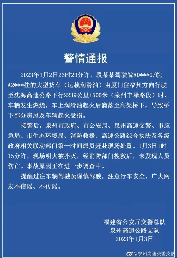 据@泉州高速交警支队微博消息,2023年1月2日23时23分许,段某某驾驶皖AD***9/皖A2***挂的大型货车(运载润滑油)由厦门往福州方向行驶至沈海高速公路下行2239公里+500米(泉州丰泽路段)时,车辆发生燃烧,车上润滑油起火后滴落至高架桥下,导致桥下部分房屋及车辆起火受损。