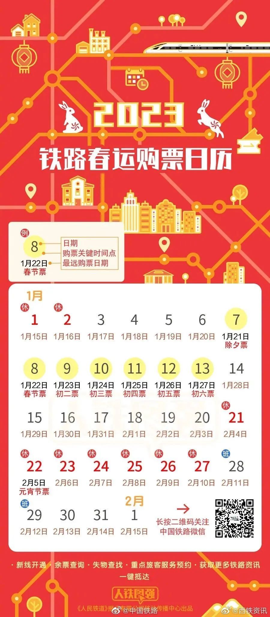 1月5日起至1月7日,2023年春运高峰期火车票迎来售票高峰,7日当天可购买除夕当日火车票,1月5日起可购买春节前三天车票。