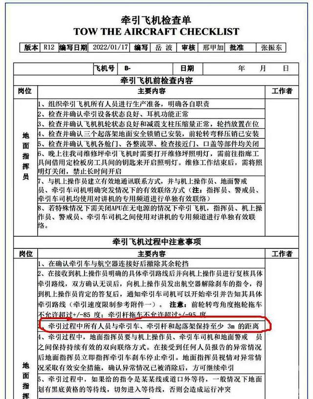 监控视频显示,6点23分57秒,在飞机行进至605机位附近时,指挥员随身携带的《牵引飞机检查单》散落到机坪地面上,于是指挥员背对飞机、弯腰持下蹲姿势尝试捡拾检查单。6点24分03秒,指挥员在被飞机右内侧主轮碾轧,不幸身亡。7秒后,被拖行的飞机停住。