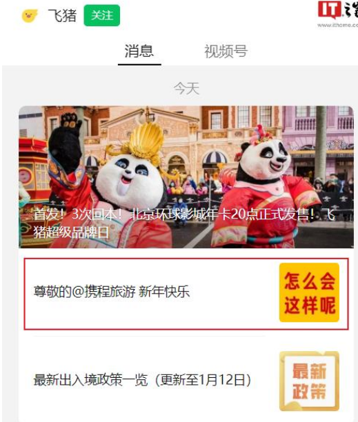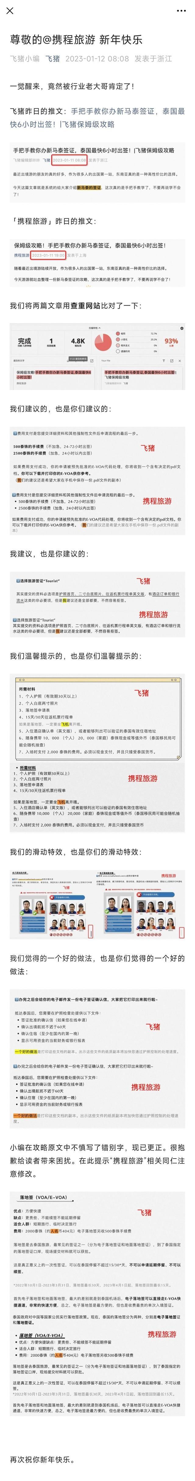 阿里巴巴旗下的综合性旅游出行服务平台飞猪今日发文《尊敬的 @携程旅游 新年快乐》,在文中直指携程旅游抄袭其昨日的推文。