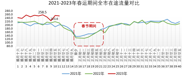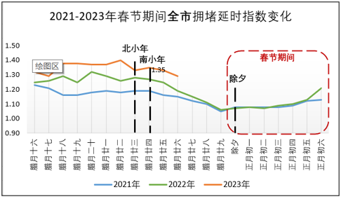 根据近两年数据分析,春节期间全市日均在途车流量约145万辆,整体呈先低后高的趋势,除夕当天为最低峰。假期前一日和除夕当天进出城拥堵程度略有上升,返程相比更为集中,正月初五至初六,返汉车流增多,路网拥堵延时指数随之明显上升。