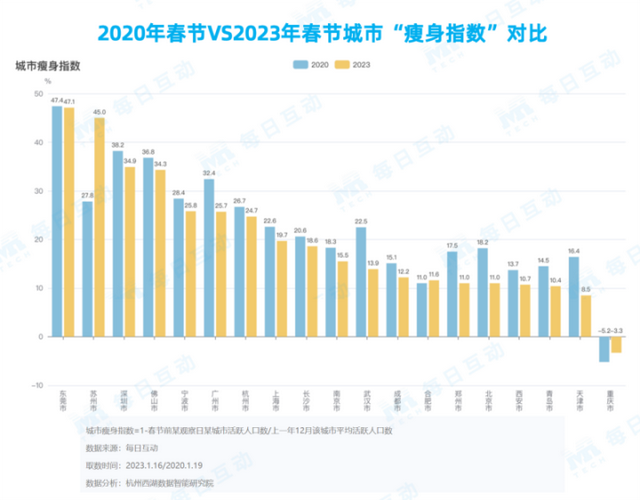 2023年春节,随着防疫新政的落地,“回家过年”的热闹景象不断升温。每日互动大数据联合杭州西湖数据智能研究院共同发布了“2023年春运报告”,从城市瘦身指数、交通类App活跃情况、城市火车站热力值及城市流出人群去向分布等维度,对一线、新一线城市进行数据洞察。