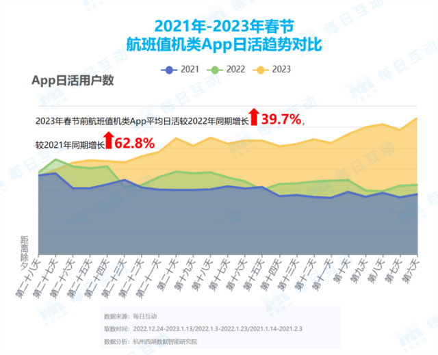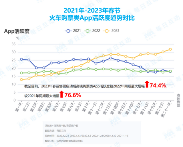 数据表明,2023年春节,火车购票类App的活跃度呈现持续上涨的趋势,反映出人们的购票意愿也在持续“升温”。对比历年同期数据,2023年春运售票首日(即2022年12月24日),由于受疫情新形势的影响,大家对于回家过年还持观望态度,因此初期火车购票类App的活跃度处在近三年里最低水平。随着出行和生活的逐渐恢复,人们的“返乡情节”被激活,火车购票类App的活跃度开始高速增长,较历年同期活跃度最大增幅超70.0%。