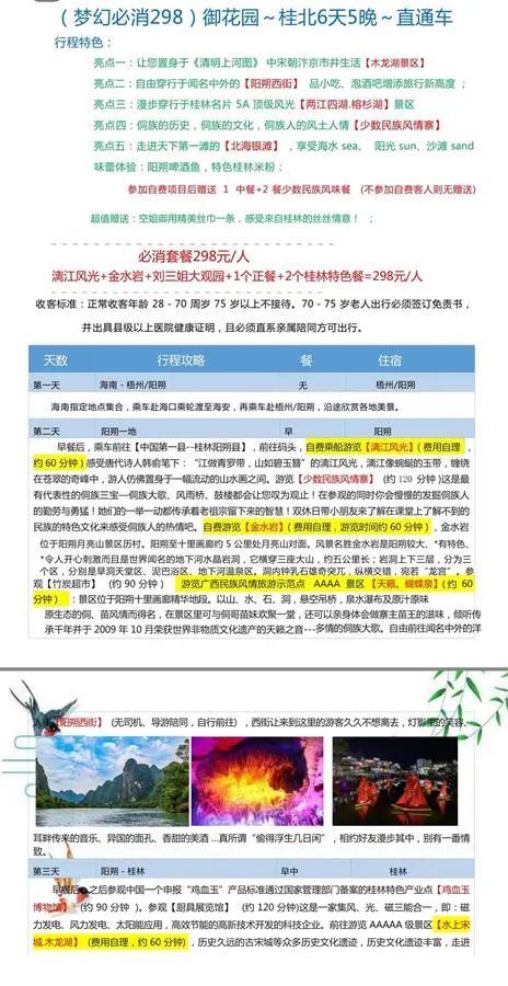记者从陈先生提供的行程表上可见,该行程为6天5晚,从海南集合,前往桂林、北海游玩,298元属于必须的消费,途中安排了漓江、金水岩等景区,也有厨具展览馆、乳胶体验馆等十几个购物点。