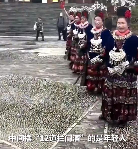 对此,景区工作人员表示,两边站的都是年长的,中间摆 "12 道拦门酒 " 是年轻人,按照我们苗族的礼节,年轻人来敬酒是迎客的一种方式。