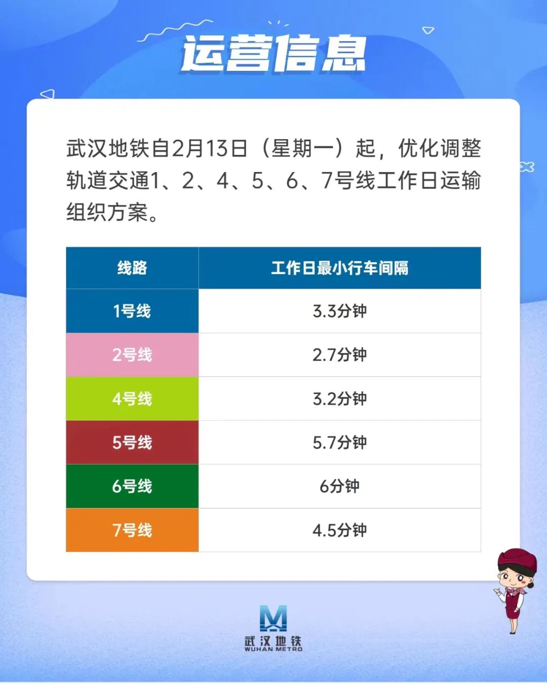从武汉地铁运营公司了解到,2月13日起,武汉地铁调整1、2、4、5、6、7号线工作日运输组织方案,进一步提高运力,压缩行车间隔。这也是今年春节过后第四次调图,乘客高峰时段候车时间将减少。