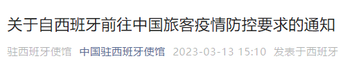 据中国驻西班牙使馆微信公众号13日消息,根据新冠疫情形势发展和便利人员往来需要,自2023年3月15日起(当地时间),允许搭乘自西班牙赴华直飞航班人员以抗原检测(包括用试剂盒自测)替代核酸检测。为便于旅客做好行前准备,中国驻西班牙使领馆更新了《自西班牙前往中国旅客疫情防控指南》,请认真阅读,遵照执行,以免影响行程。