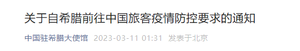 据中国驻希腊大使馆微信公众号11日消息,根据新冠疫情形势发展和便利人员往来需要,自希腊时间2023年3月15日起,允许搭乘自希腊赴华直飞航班人员以抗原检测(包括用试剂盒自测)代替核酸检测。
