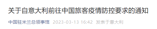 据中国驻米兰总领事馆微信公众号13日消息,根据新冠疫情形势发展和便利人员往来需要,自意大利当地时间2023年3月15日起,允许搭乘自意大利来华直飞航班人员以抗原检测(包括用试剂盒自测)替代核酸检测。为便于旅客做好行前准备,驻意大利使馆更新了《自意大利前往中国旅客疫情防控指南》,请认真阅读,遵照执行,以免影响行程。