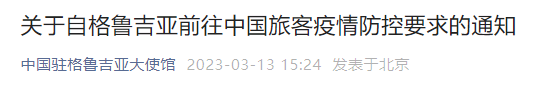 据中国驻格鲁吉亚大使馆微信公众号13日消息,根据新冠疫情形势发展和便利人员往来需要,自2023年3月15日起(当地时间),允许搭乘自格鲁吉亚赴华直飞航班人员以抗原检测(包括用试剂盒自测)替代核酸检测。为便于旅客做好行前准备,驻格鲁吉亚使馆更新了《自格鲁吉亚前往中国旅客疫情防控指南》,请认真阅读,遵照执行,以免影响行程。