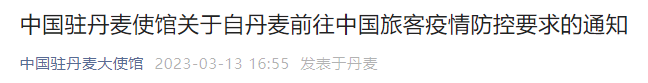 据中国驻丹麦大使馆微信公众号13日消息,根据新冠疫情形势发展和便利人员往来需要,自2023年3月15日起(当地时间),允许搭乘自丹麦赴华直飞航班人员以抗原检测(包括用试剂盒自测)替代核酸检测。结果阴性者可赴华,并需行前如实进行海关健康申报。为便于旅客做好行前准备,中国驻丹麦使馆更新了《自丹麦前往中国旅客疫情防控指南》。请认真阅读,遵照执行,以免影响您的行程。