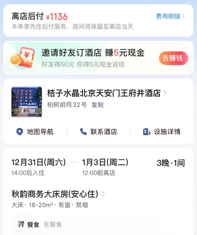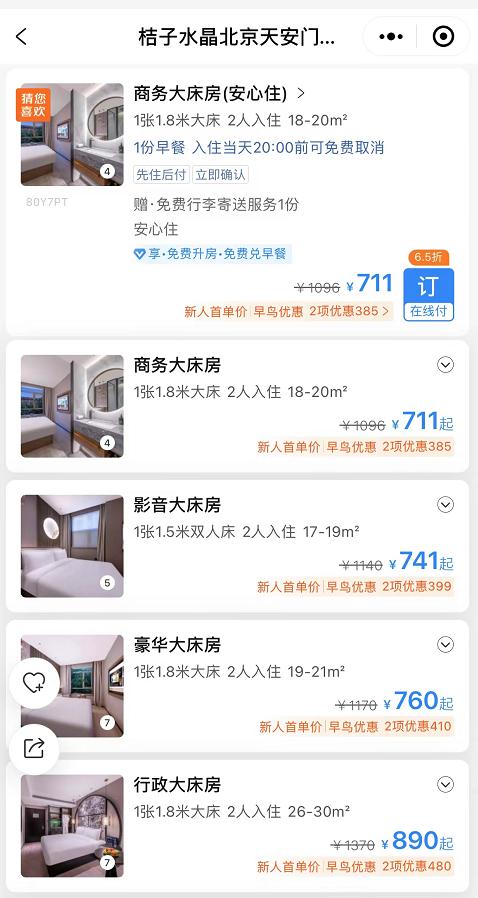 对于北京酒店价格的变化,李女士深有体会。3月15日,李女士向红星资本局展示此前的酒店订单,去年元旦节住的桔子水晶酒店(北京天安门王府井店)是378元/晚。到了今年3月,价格翻倍,涨到711元/晚,五一节预订价更是涨到了1500元/晚。