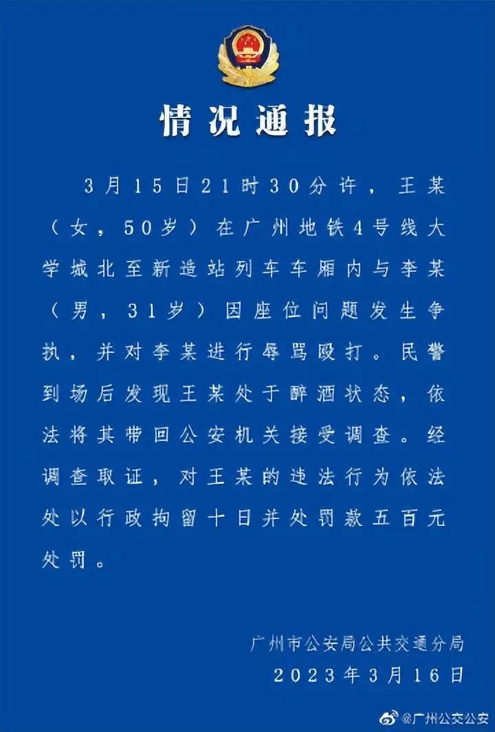 广州公交警方3月16日通报:3月15日21时30分许,王某(女,50岁)在广州地铁4号线大学城北至新造站列车车厢内与李某(男,31岁)因座位问题发生争执,并对李某进行辱骂殴打。民警到场后发现王某处于醉酒状态,依法将其带回公安机关接受调查。经调查取证,对王某的违法行为依法处以行政拘留十日并处罚款五百元处罚。