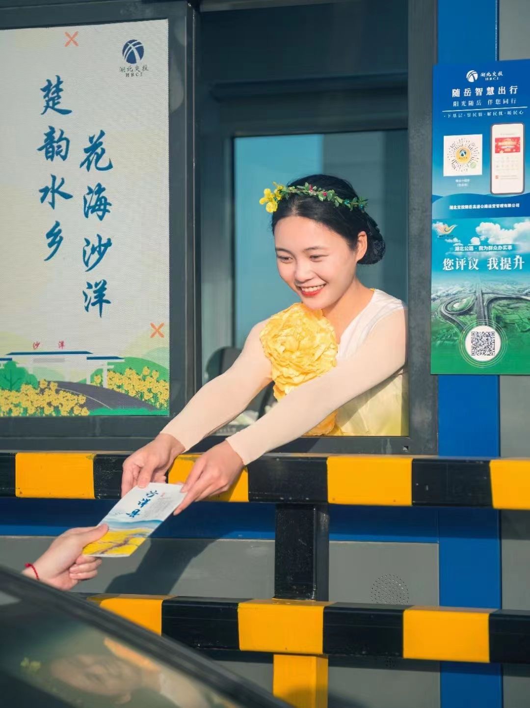 “小姑娘,帮我们拍张合影吧,这个布置挺别致的”。为营造油菜花节的良好氛围,随岳运营公司在沙洋收费站出口处设置“油菜花海”打卡区,身着汉服的收费员与过往司乘朋友积极互动。