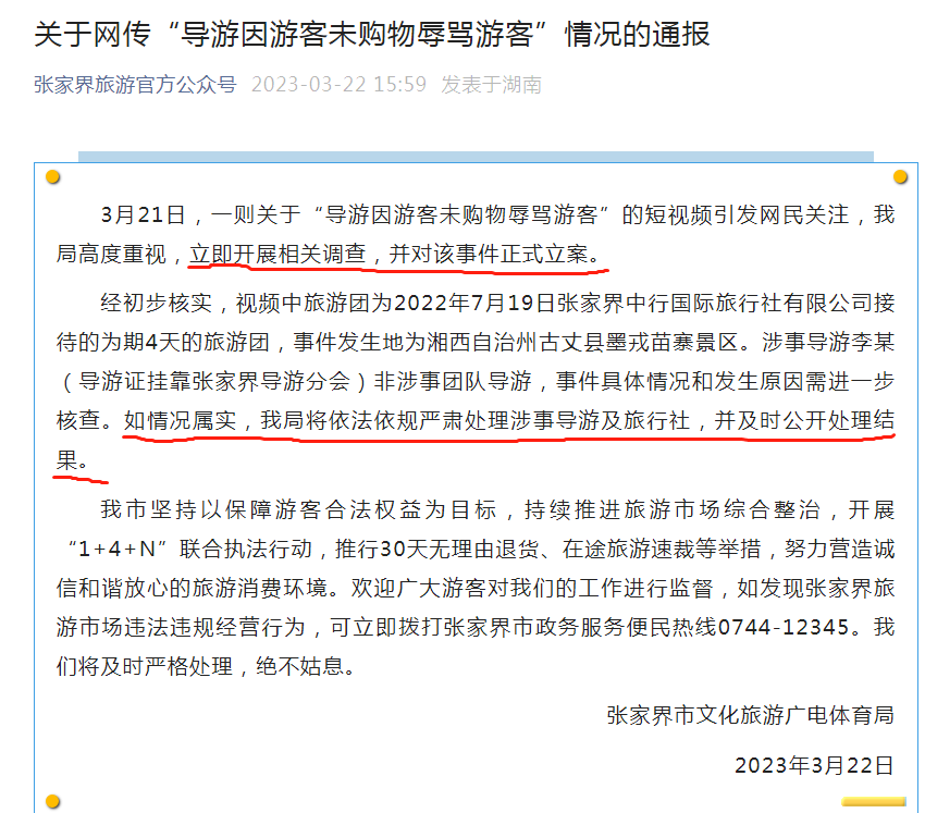 张家界市文化旅游广电体育局表示,如情况属实,将依法依规严肃处理涉事导游及旅行社,并及时公开处理结果。