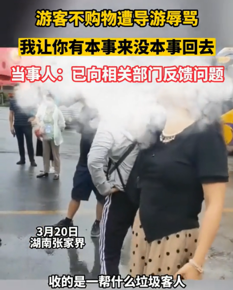 近日,又有网友曝出在张家界旅游遭遇类似事件。视频中一名导游辱骂道:“收的是一帮什么垃圾客人”,甚至威胁道:“我让你有本事来,没本事回去!”