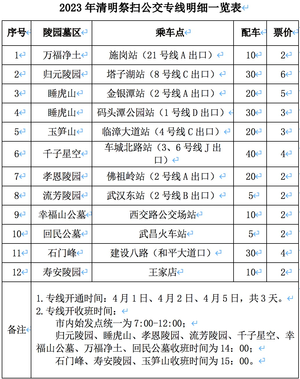 祭扫公交专线开通时间为:4月1日、4月2日和4月5日共3天。开班时间:市内始发点统一为每天7:00至12:00。收班时间:归元陵园、睡虎山、孝恩陵园、流芳陵园、千子星空、幸福山公墓、回民公墓、万福净土等墓区14:00收班;石门峰、玉笋山、寿安陵园等墓区15:00收班。
