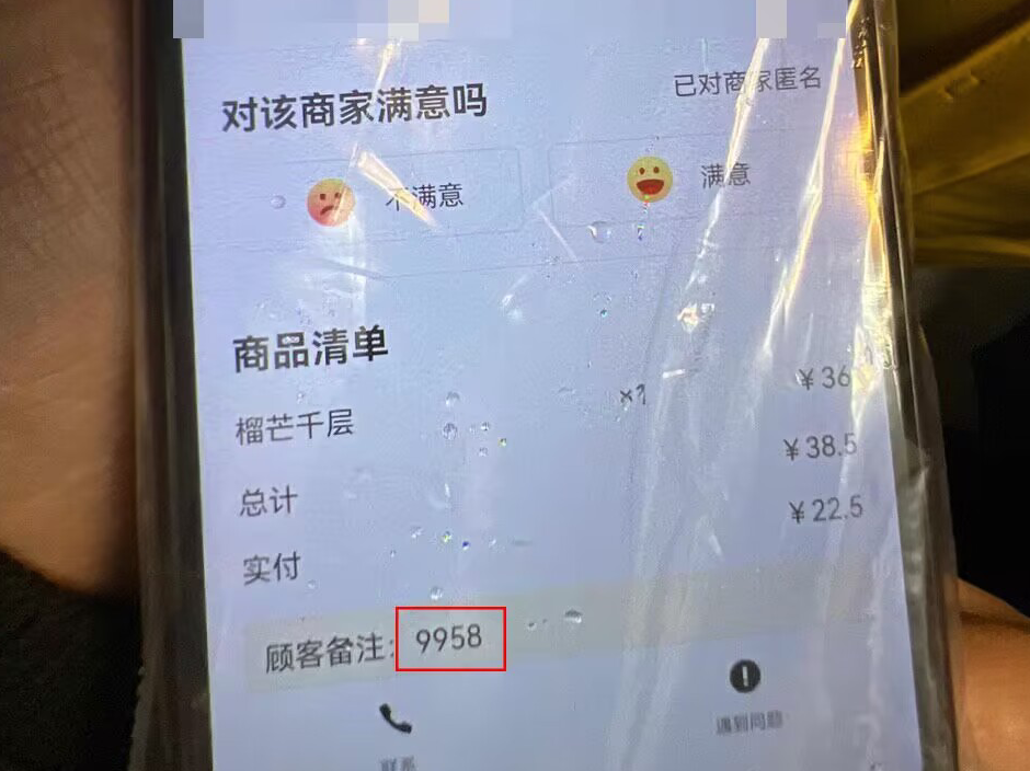 3月21日晚,一名外卖小哥在接到订单后,发现备注写了“9958”。