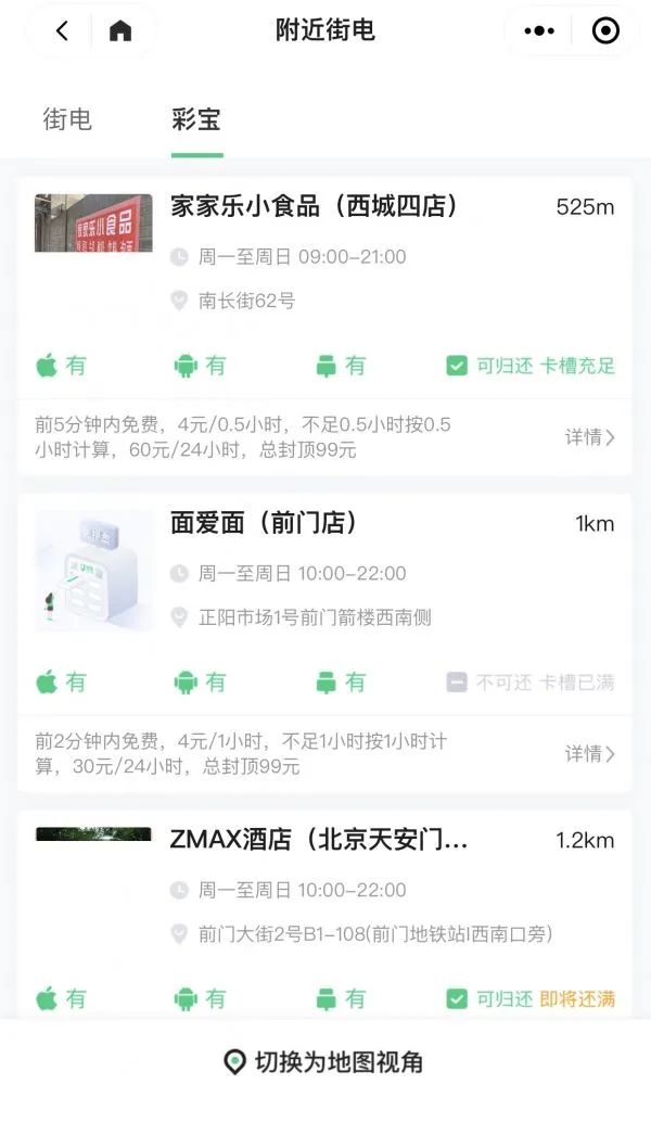 3月24日,记者在东西湖区银谭路的一家商铺里的半嵌入“街电”设备中租借了一个“彩宝”,随后记者在“街电”小程序里的“附近街电”一栏里看到“彩宝”和“街电”两个分类,点击“彩宝”后可以看到附近的可归还点位以及此处设备是否还满。