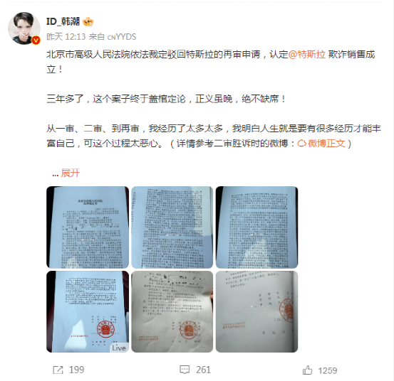 值得注意的是,这是特斯拉在国内首例“退一赔三”案中败诉,车主韩先生历时三年多维权,经历一审、二审、再审,终获胜利