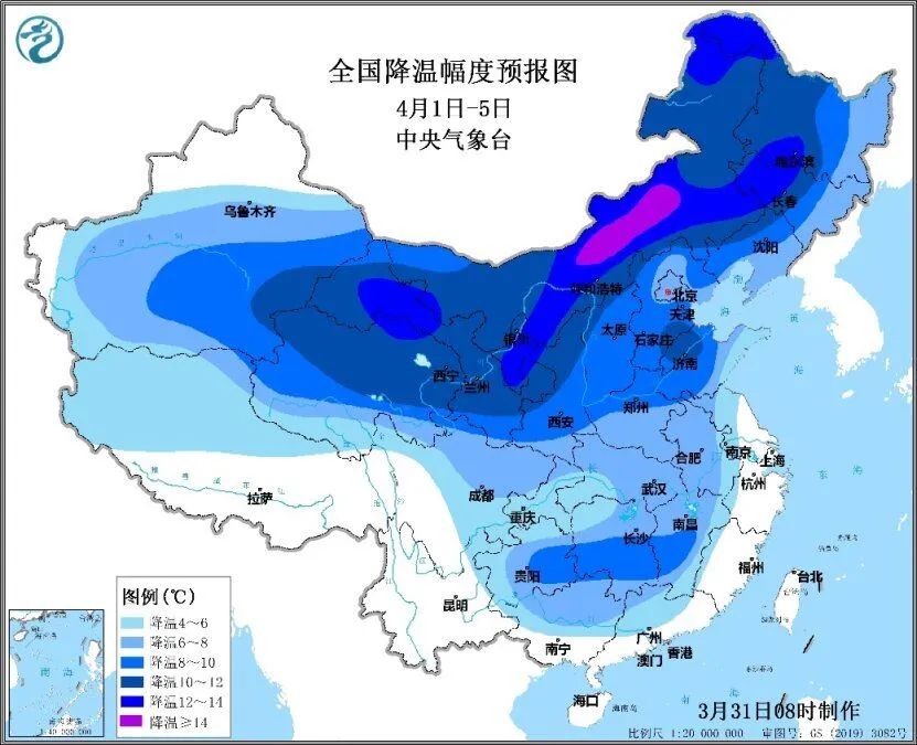 其中,北方降温更为剧烈,北方大部地区气温下降6-10℃,内蒙古部分地区降温幅度可超过12℃,南方地区气温下降4-8℃,并伴有4-6级偏北风,阵风7-9级,甘肃河西、内蒙古中西部和宁夏等地将出现沙尘天气。