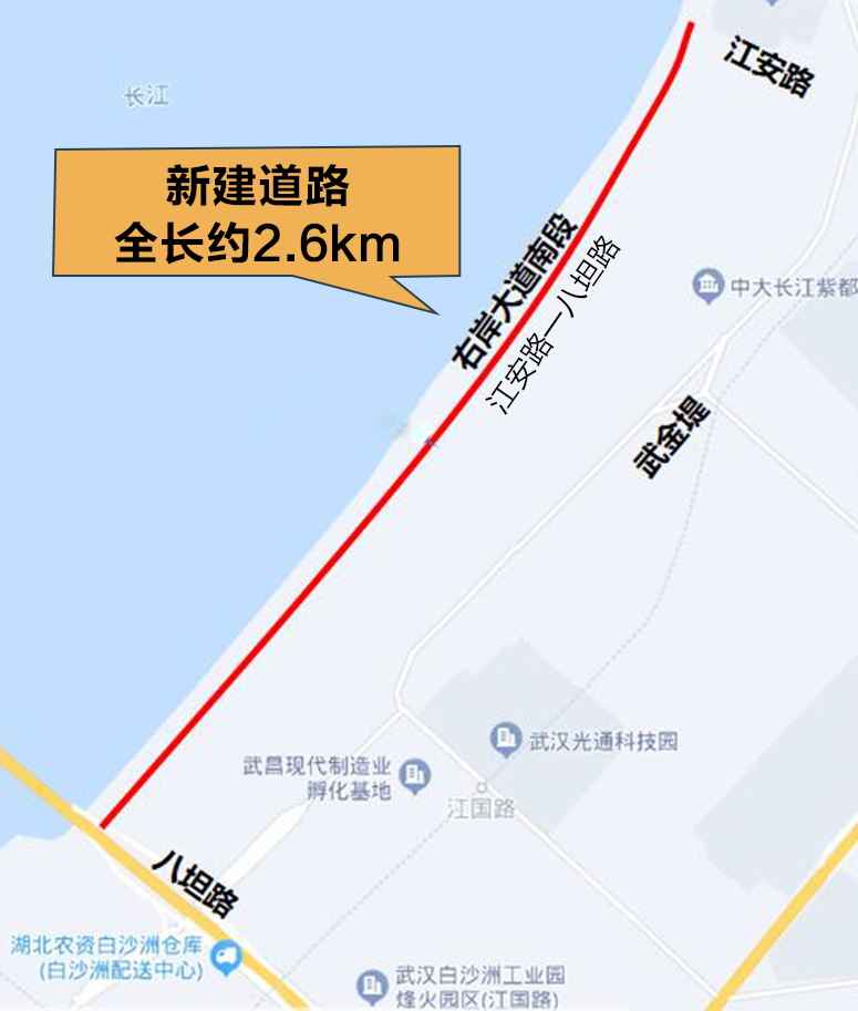 工程北接江安路,顺江一路南下,直抵杨泗港长江大桥,与白沙洲八坦路顺接,道路全长约2.65公里,双向六车道。
