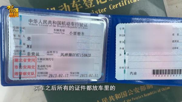 陈先生介绍,车是2月17日新买的,所有的证件都放在车里:“我去问过这边车管所,他说这里过户不需要原车主去,只要发票绿本之类的证件就可以过户了。”