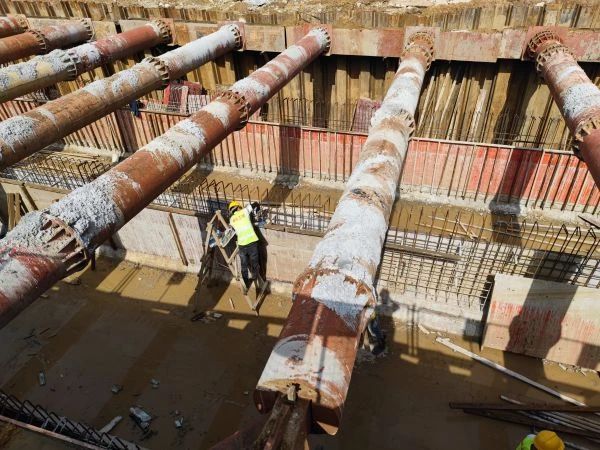 百步亭路(景秀街—和谐大道)工程现场,工人们在箱涵和基坑施工
