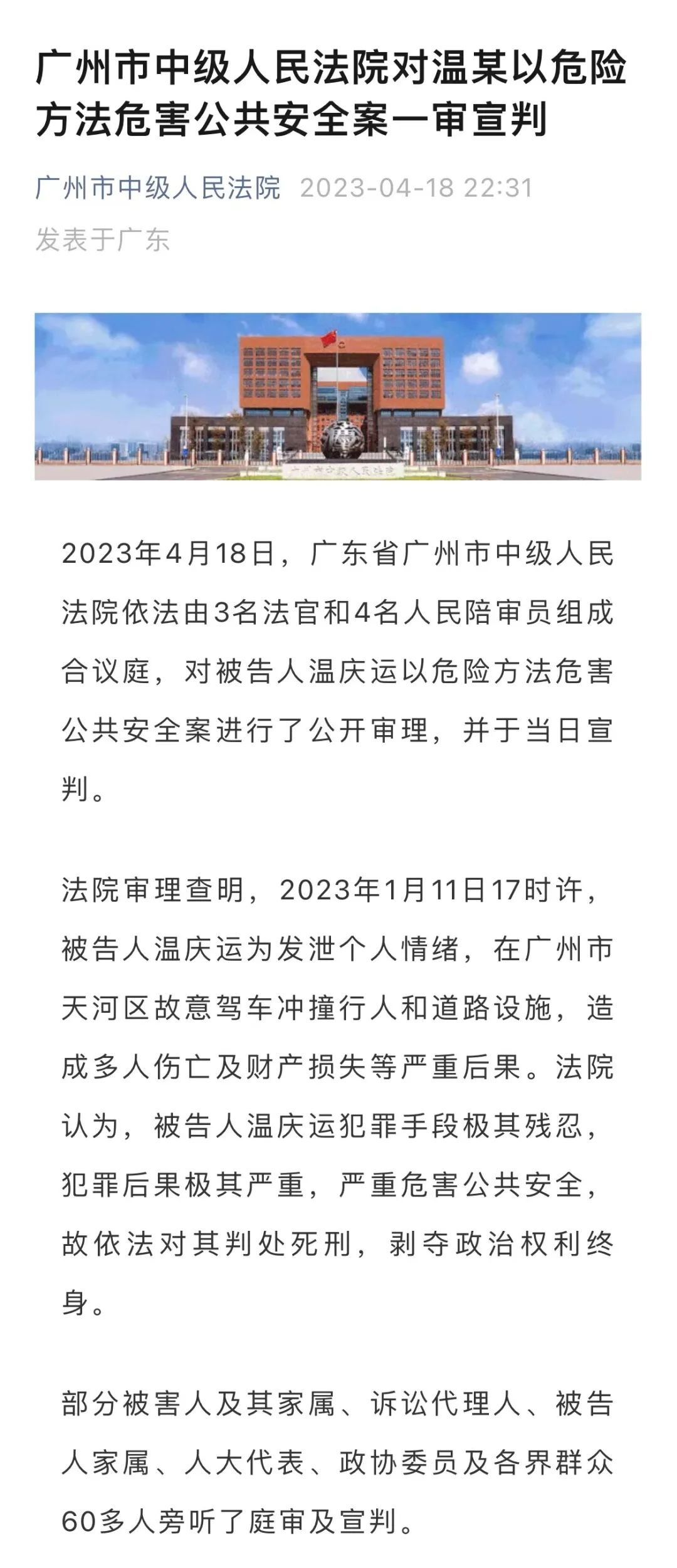 据广州市中级人民法院微信公号18日消息,广州市中级人民法院对温某以危险方法危害公共安全案一审宣判。