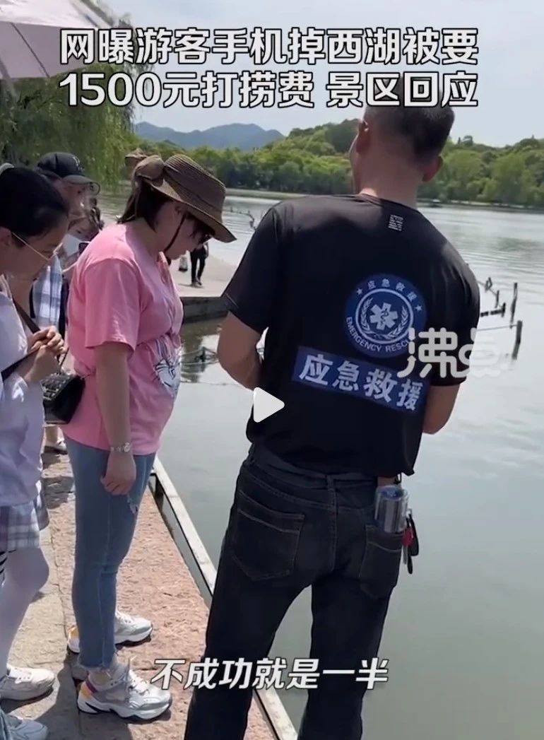 5月2日,杭州有游客发布视频称,手机掉到西湖里,被一位衣服上写着“应急救援”的男子要价1500元捞起,他还称若未捞起半价。