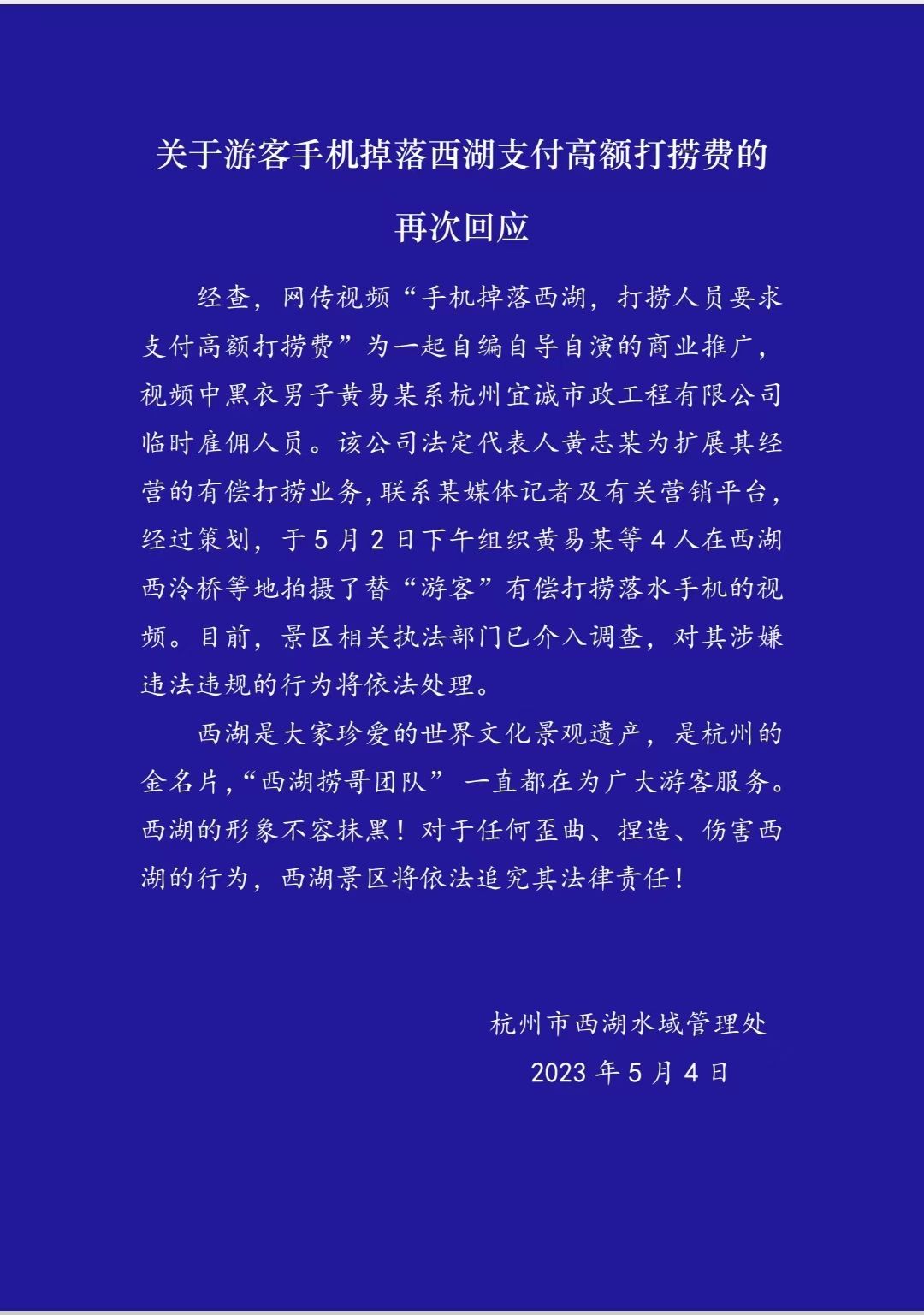5月4日晚,杭州市西湖水域管理处发布最新通报,就游客手机掉落西湖支付高额打捞费再次回应。