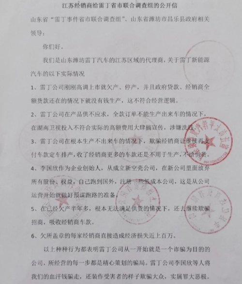 值得注意的是,2023 年 2 月,雷丁汽车被经销商联名举报。经销商集体签字盖章的《江苏经销商给雷丁省市联合调查组的公开信》中认为,雷丁汽车是一家诈骗公司。经销商列举了几大理由,包括:雷丁公司刚上市就欠产、停产;在产品供不应求的情况下,在湖南卫视投入高额费用搞宣传;在生产不出车的情况下,继续欺骗招商;创始人李国欣在海外注册公司,有圈钱跑路的嫌疑。经销商认为,这些都是造车骗局的迹象。