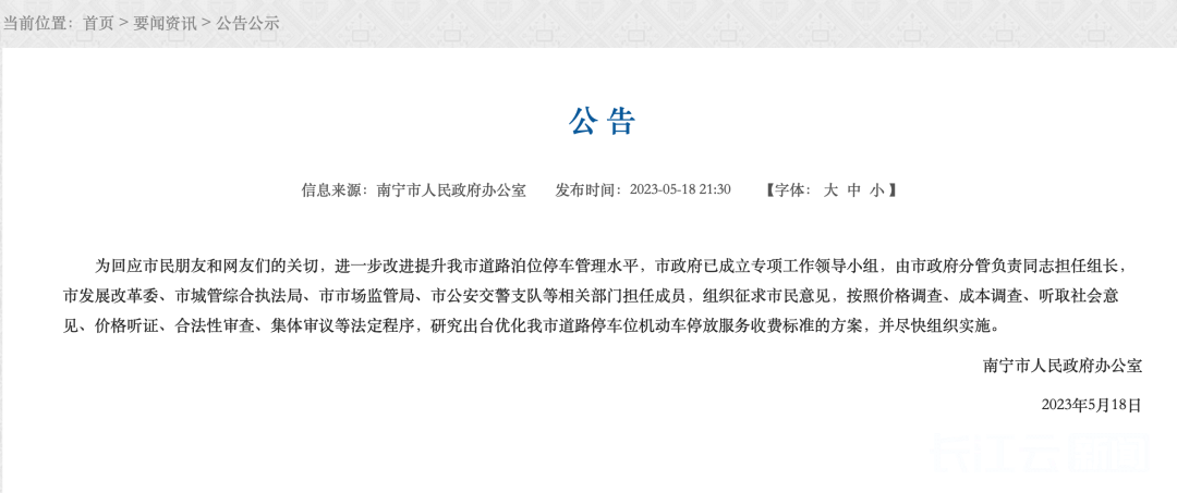 针对网络舆论争议,5月18日,南宁市政府连续发布两则公告,宣布已成立专项工作领导小组,将研究出台优化道路停车收费方案并尽快组织实施。