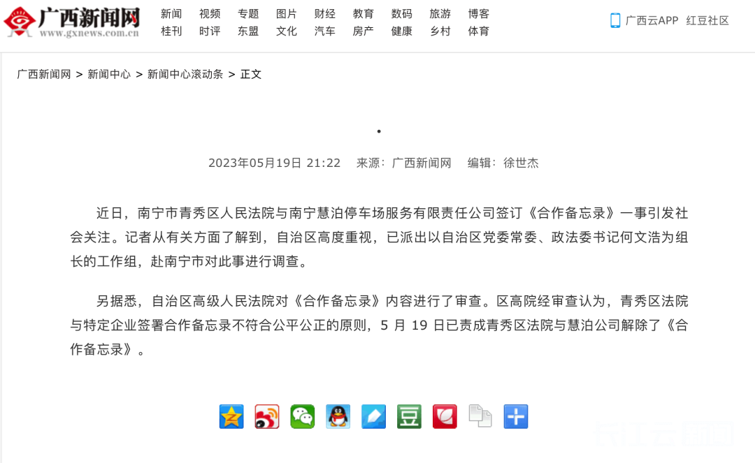 针对停车欠费追缴方式不适当问题,昨晚,当地官方媒体发布消息称,近日,南宁市青秀区人民法院与南宁慧泊停车场服务有限责任公司签订《合作备忘录》一事引发社会关注。广西壮族自治区高级人民法院对《合作备忘录》内容进行了审查。区高院经审查认为,青秀区法院与特定企业签署合作备忘录不符合公平公正的原则,5月19日已责成青秀区法院与慧泊公司解除了《合作备忘录》。