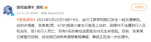 据上海市公安局普陀公安分局官方微博通报:2023年5月22日18时19分,金沙江路枣阳路口发生一起交通事故。经初步调查,张某某(男,67岁)驾驶小客车行驶至上址时,因操作不当撞到行人及机动车,致1名行人死亡,另有5名伤者经送医救治均无生命危险。目前,张某某已被警方控制,经检测已排除其酒驾毒驾嫌疑,事故正在进一步处理中。