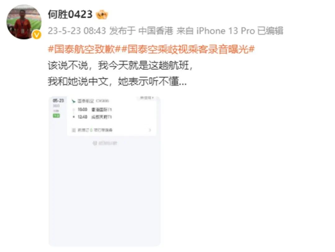 据九派新闻,“退钱哥”何胜近日在乘坐国泰航空的航班时也遇到了类似情况。5月23日,在个人社交账号上,何胜发文:“该说不说,我今天就是这趟航班,我和她说中文,她表示听不懂……”