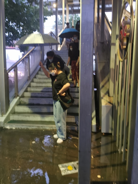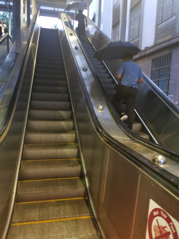 同济健康天桥的手扶梯未启动,下雨天行人打伞通行十分不便