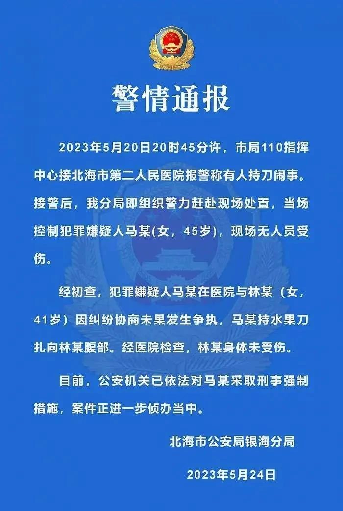 2023年5月20日20时45分许,市局110指挥中心接北海市第二人民医院报警称有人持刀闹事。接警后,北海市公安局银海分局即组织警力赶赴现场处置,当场控制犯罪嫌疑人马某(女,45岁),现场无人员受伤。