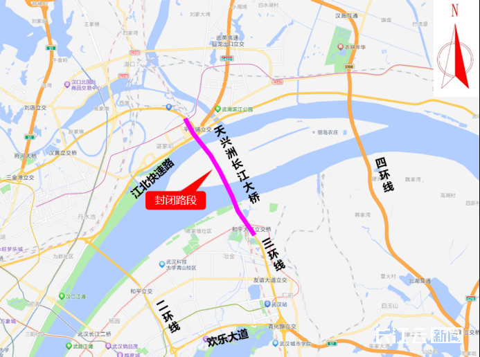 原通行天兴洲长江大桥的客货车辆需分别绕行周边桥梁过江,即客车绕行二七长江大桥(二环线)、货车绕行青山长江大桥(四环线)。具体绕行线路如下: