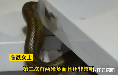 7月6日凌晨2点左右,聂女士家人起来喝水时,在厨房里发现有一条1米多的三角形头的蛇,报警119后未抓到。7月8日,聂女士又发现有一条长2米多,且非常粗的蛇在厨房柜子上盘旋,报警后未抓到。