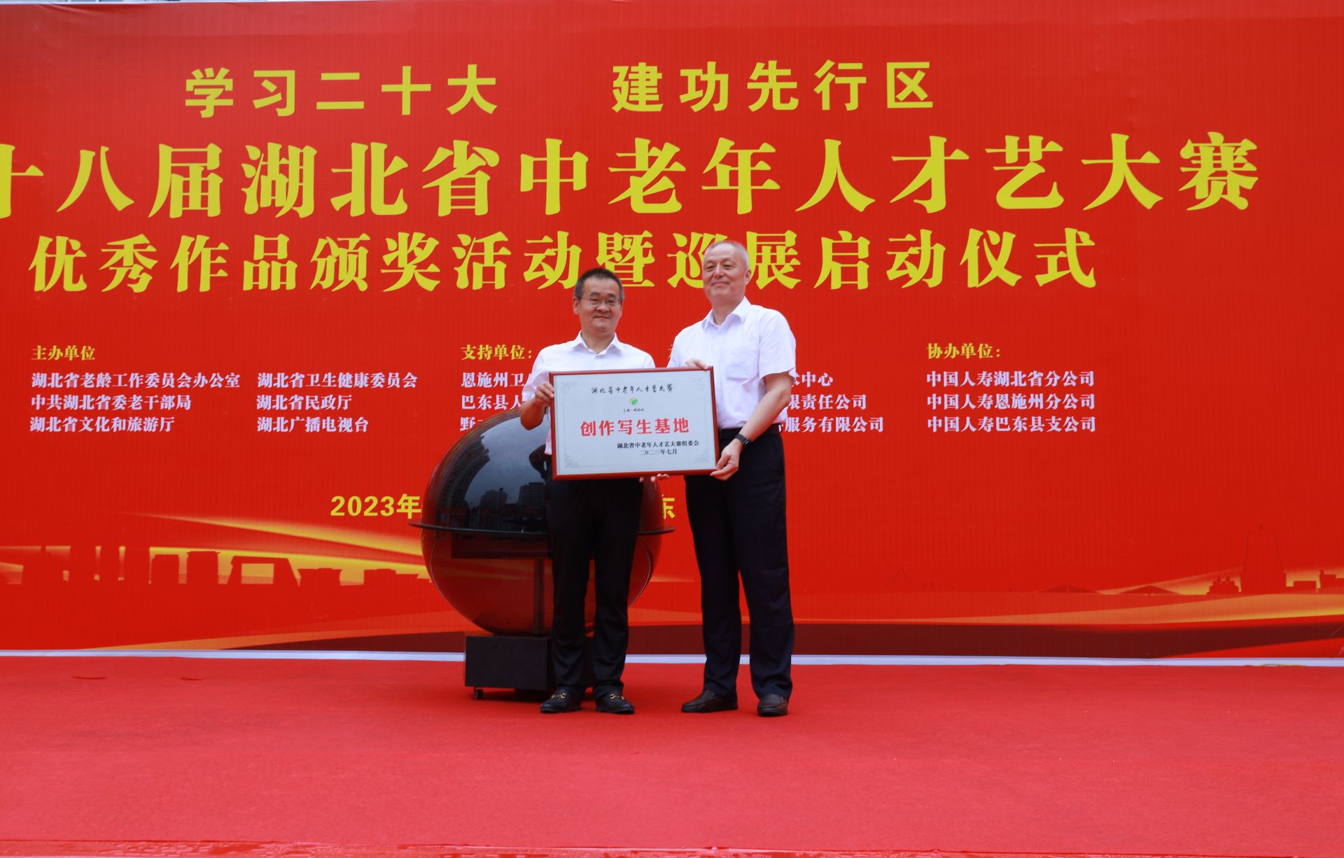 7月19日上午,应湖北省恩施州巴东县人民政府承办申请,由省老龄办、省卫生健康委、省委老干部局、省民政厅、省文化和旅游厅、湖北广播电视台联合举办,湖北老年书画艺术中心、湖北广电报业有限责任公司承办,中国人寿保险股份有限公司湖北省分公司协办的2023年第十八届湖北省中老年人才艺大赛颁奖活动暨获奖作品巡展启动仪式,在恩施州巴东县野三关镇政府广场举行。
