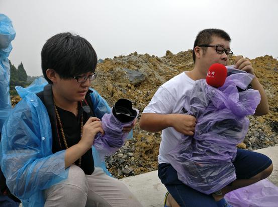 在凤凰县菖蒲塘村的采访中,记者团遭遇了阴雨天气,摄影记者顾不上自己穿上雨披,首先想到的是保护好设备、保障好拍摄(央广网 陈欣摄)