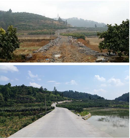 上图为2014年,菖蒲塘村基地产业路建设初期;下图为2016年的同一地点,记者一行从这条路走进菖蒲塘村,道路两旁是已经挂果了的柚子树、猕猴桃树、葡萄架。