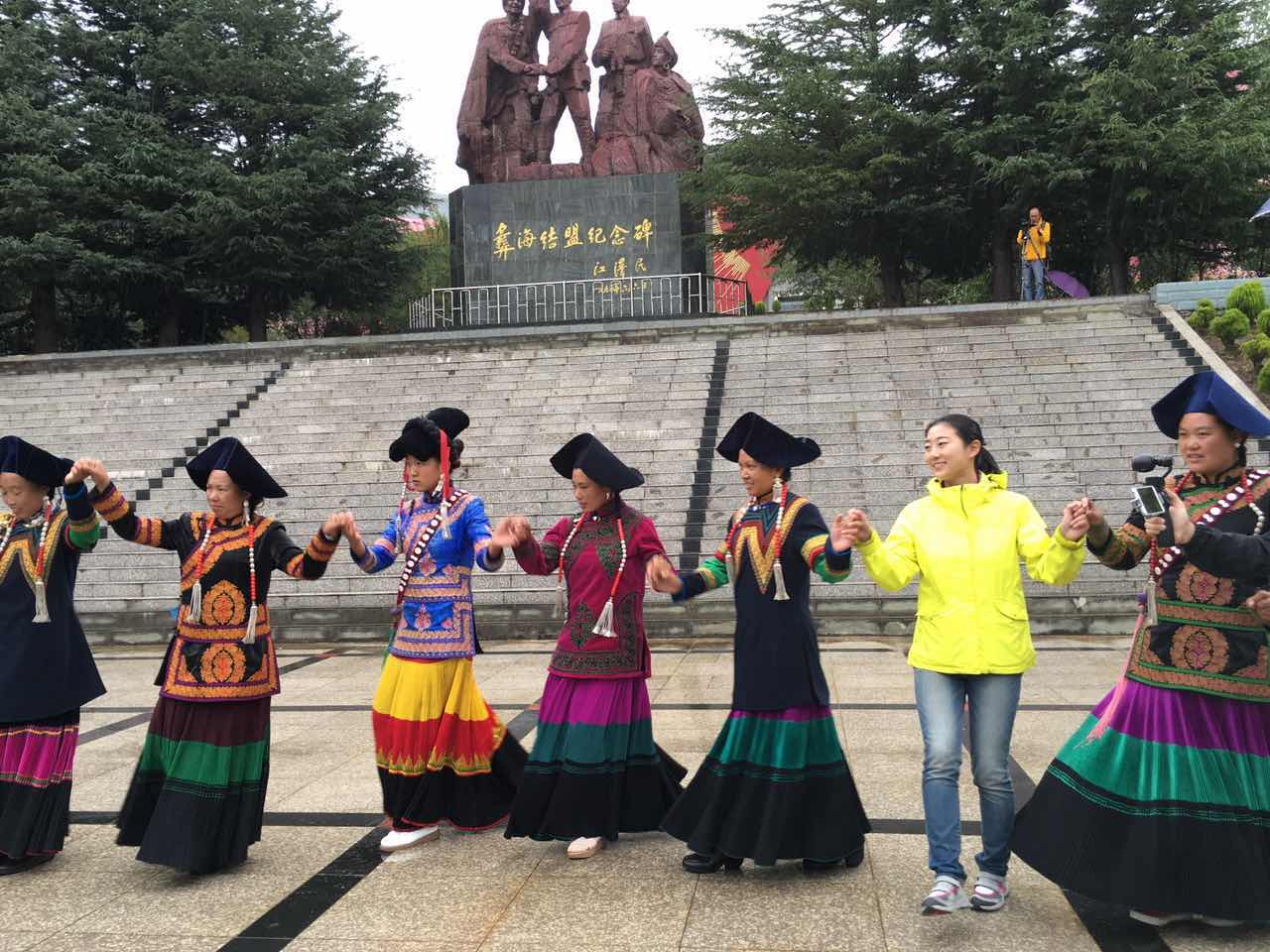 重走长征路采访团受到了当地彝族同胞的热情欢迎,彝族同胞们载歌载舞欢迎我们,采访团成员和彝族同胞一起跳起了彝族达体舞,重温当年的彝海结盟兄弟情,现场洋溢着民族团结的欢乐氛围。