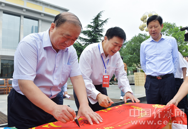 2016年9月5日,“长征路上奔小康”网络媒体“走转改”大型主题采访活动贵州站出发仪式在贵阳举行。图为省委常委、宣传部部长张广智,中央网信办网络新闻信息传播局副局长孙凯在“长征路上奔小康”网络媒体“走转改”大型主题采访活动旗子上签名。当代贵州全媒体记者 张凯 摄