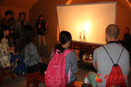 昏暗的窑洞里几个长凳,一张幕布便构成道情皮影的小剧场。幕布背后,65岁的敬延孝老人正双手操控着皮影,在器乐的伴奏下时而高亢,时而委婉地唱着古老的曲目,台下的观众已被这一切吸引进入角色。这便是环县道情博物馆的一个真实场景还原,将甘肃省非物质文化传承人、“敬家班”领头人敬延孝老人请到馆里表演道情皮影,让古老的艺术走进了百姓生活。