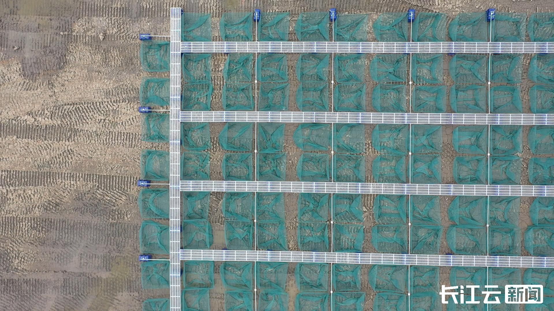 10月23日上午9点,在仙桃市张沟镇的弘玖水产浮床生态养殖示范区,长江云新闻记者看到,清澈的鱼塘里,一口口网箱成“井”字型排列。与传统养鳝网箱不同,这里的每口网箱底部都配备安装有一个蓝色的浮桶,类似一张张浮动的床,让网箱漂浮在水面上。